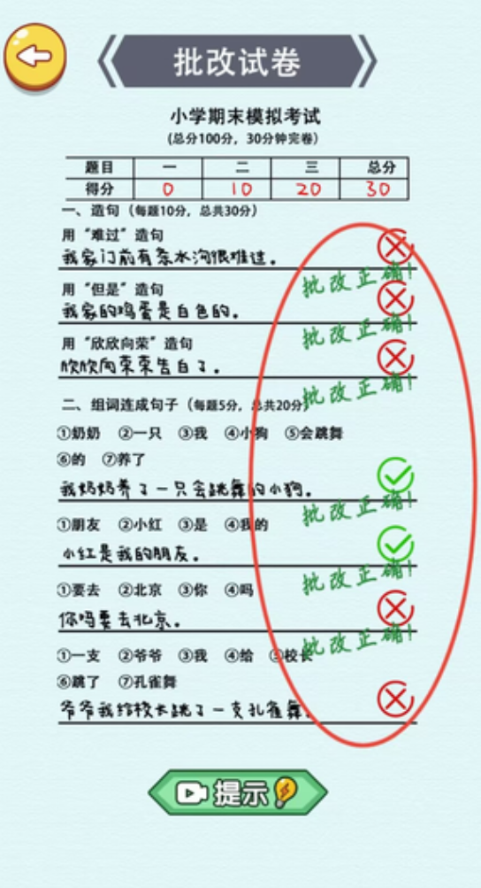 2、选定具体模式即可开始游戏,如选择试卷批改模式,需按要求完成批阅后,系统将自动验证批改准确性。