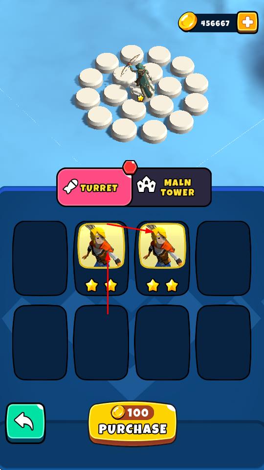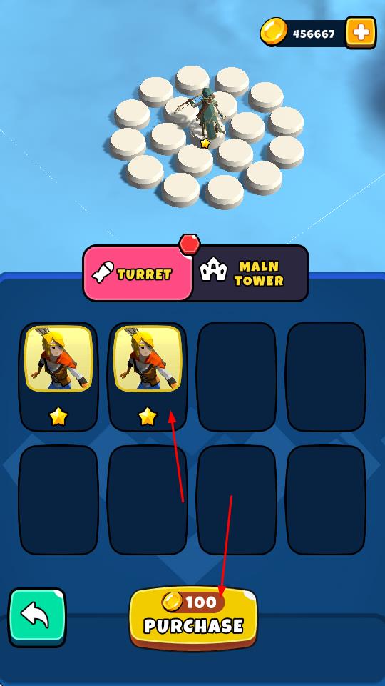 1、“购买士兵”,消耗金币(100),在“TURRET”栏购买士兵卡牌,填充防御阵容。