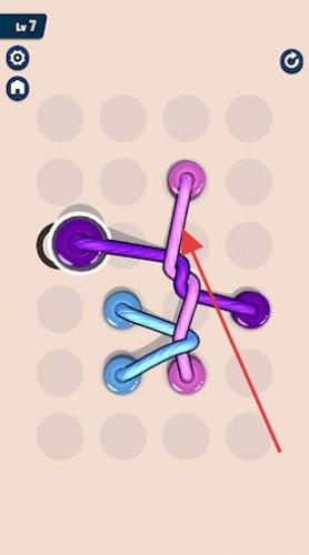 1、遇到【Lv.7】复杂绳索关卡,观察绳索缠绕结构,从边缘端点开始,尝试拖动紫色、粉色等绳索端点,逐步理顺。
