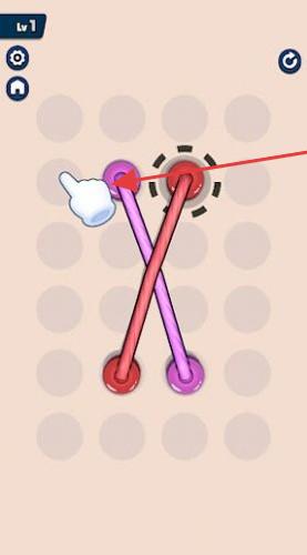 3、玩【Lv.1】基础关卡,跟随指引拖动红色绳索端点,学习解绳操作,掌握通过移动端点解开交叉绳索的基本方法。
