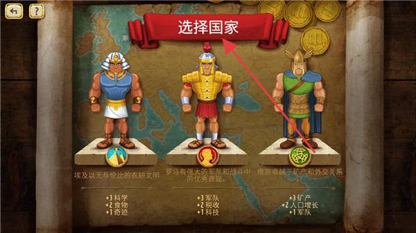 2、国家选择界面,可选择古埃及(优势:科学、食物、奇迹)、罗马(优势:军队、税收、科技)、维京(优势:矿产、人口增长、军队),开启不同帝国经营。