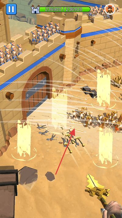 1、“城堡防御”,在沙漠城堡场景,布置士兵守城,利用城墙、城门阻挡敌方军团进攻。