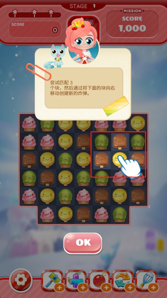 2、关卡内雪糕整齐排列,尝试交换相邻雪糕,让三颗及以上同款雪糕相连,就能看到它们消除时的清凉效果。