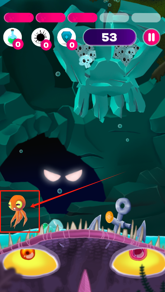 2、让章鱼躲开骷髅怪物,红箭头会提示危险方向,界面中的53是当前得分,躲避危险的同时可尝试收集得分道具提升分数。