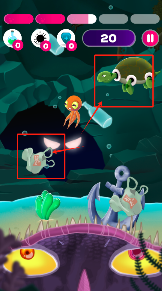 3、注意红框标注的海龟和塑料袋都要避开,底部的紫色生物会发起攻击,界面显示的20是剩余时间,需在时间结束前尽可能逃得更远。