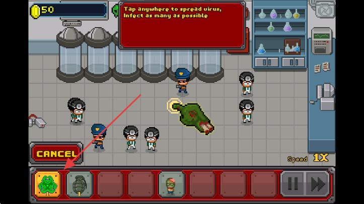 3、游戏内点击左下角绿色病毒图标,释放病毒感染场景人员。