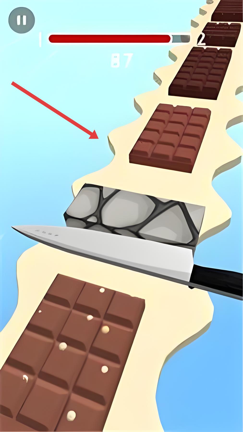 2、切割途中会遇到石头障碍,刀具碰到石头会受损,需灵活调整刀具位置,绕过石头,继续切割巧克力,利用路径上的巧克力与石头的交替,考验操作技巧。