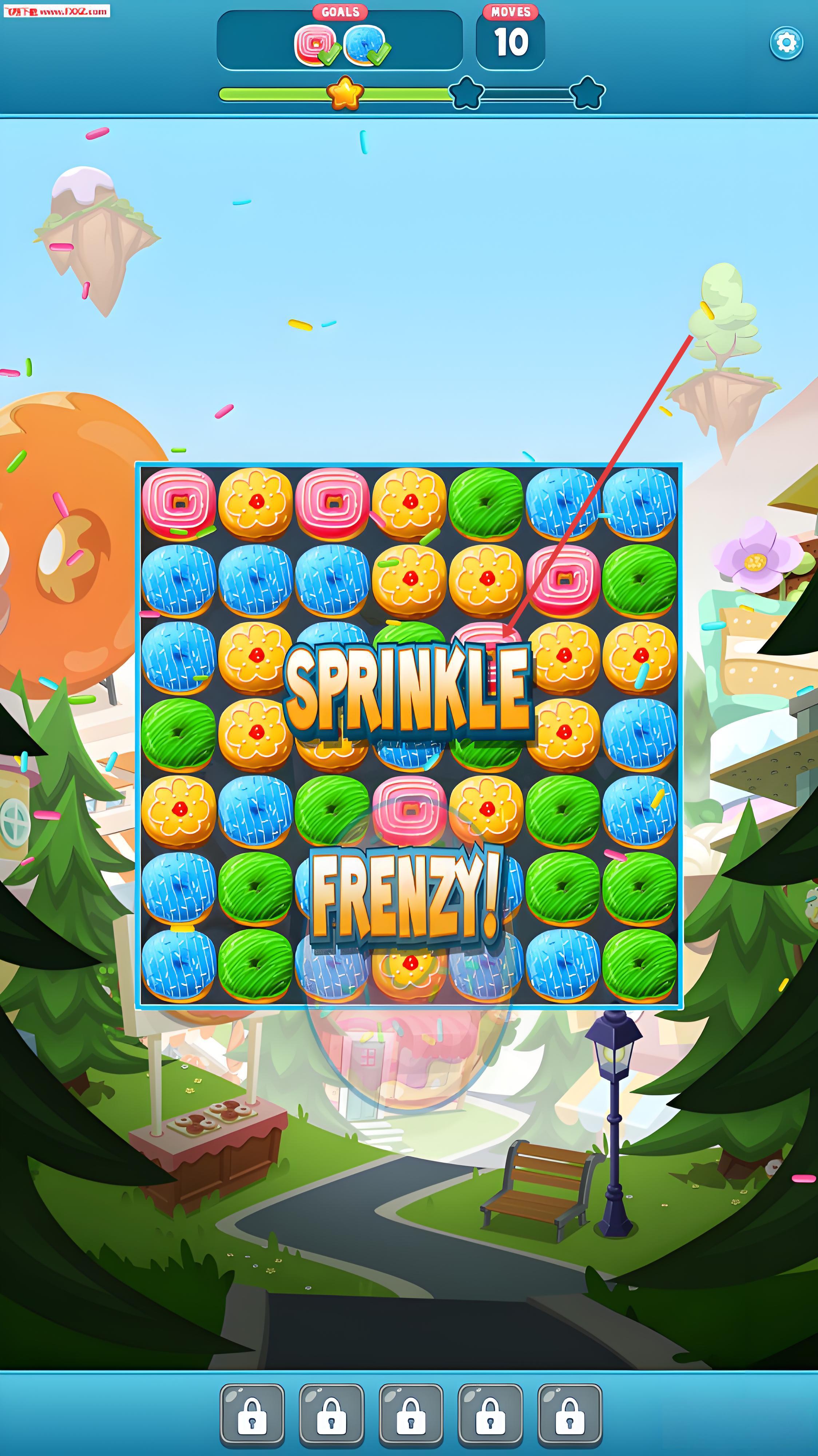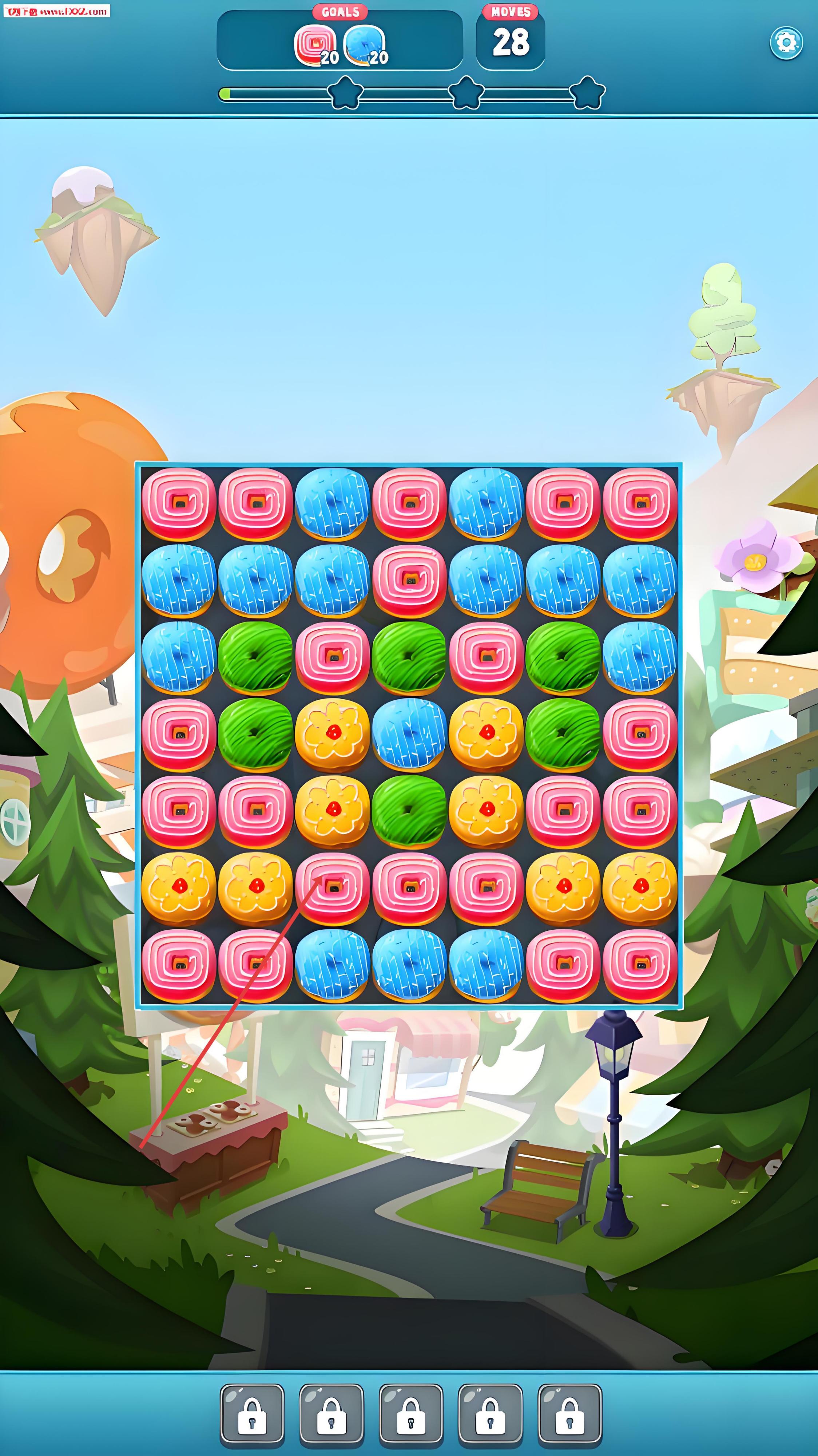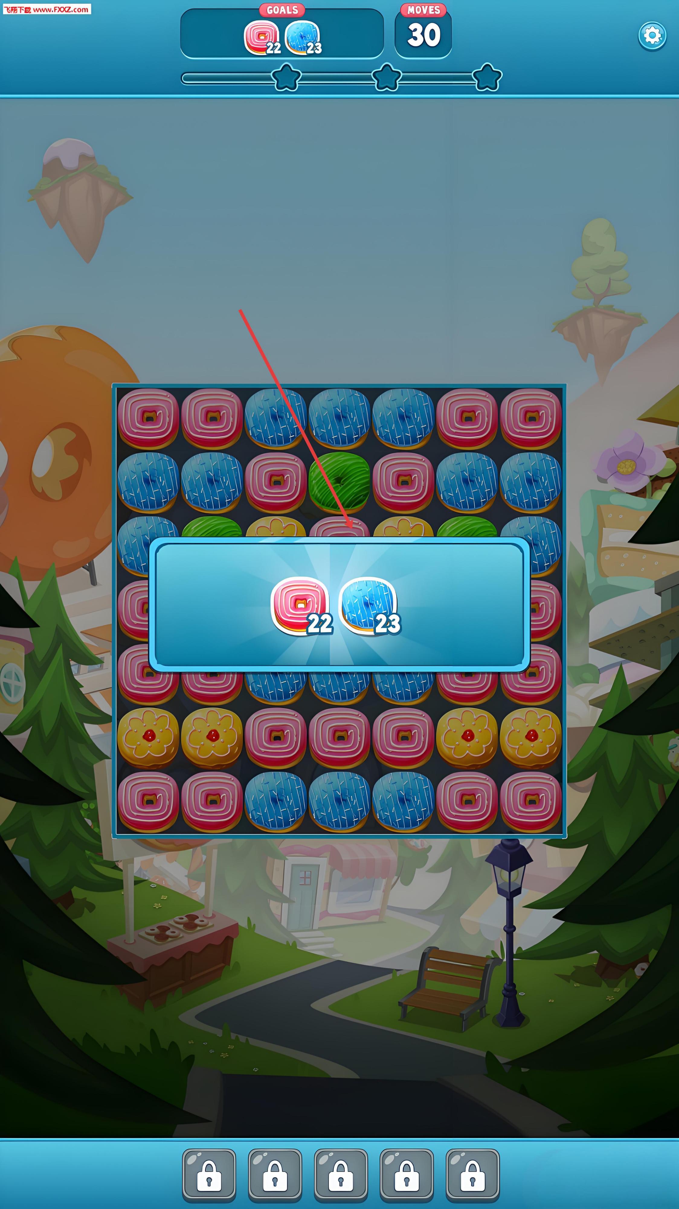 1、进入游戏后选择关卡,在消除界面中观察相同的甜甜圈及食物分布,通过滑动屏幕将三个或以上相同元素连成一线,完成消除并获得分数与资源。