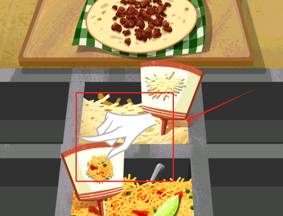 2、在部分互动环节中,用白色手指图标从下层盒子抓取黄色米饭,夹层的薯条和上层的棕色食物可随意搭配,将格子布摆满即可完成对应任务,考验快速搭配能力。