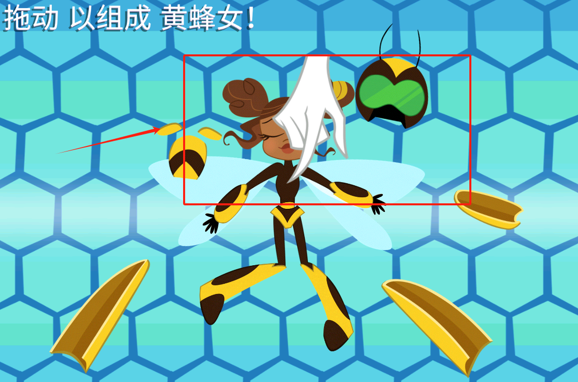 3、拖动散落的黄黑部件,将头部零件按红框标注的位置组装,拼出完整的黄蜂女角色,背景中的蜂巢场景设计十分可爱,增强角色代入感。