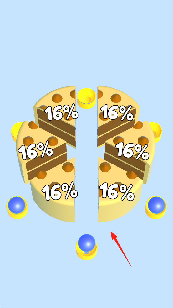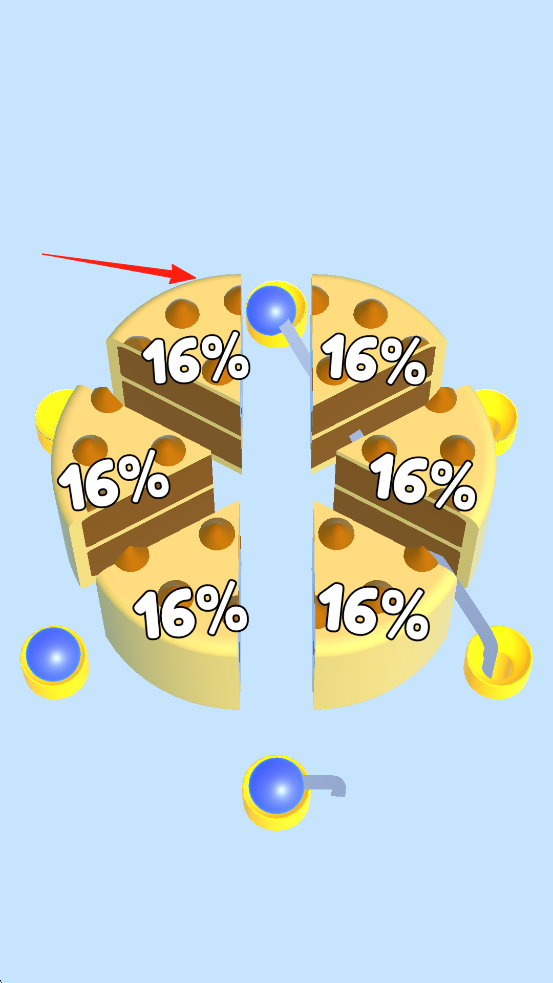 2、切割后圆盘分成多块,每块标有16%,蓝球与空圆柱需对应,观察蓝球位置、圆柱空缺,将蓝球引导至对应圆柱,利用切割后的百分比标识与结构空隙。