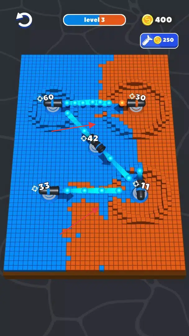 1、“连接管道”,拖拽管道连接己方炮台(带数字),构建传输线路,拓展领地范围。