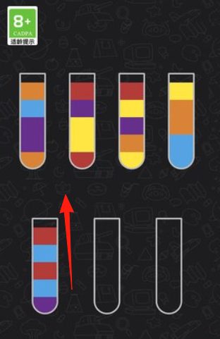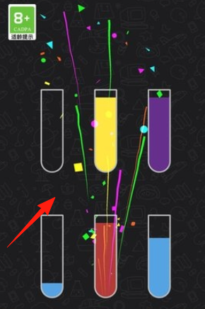 3、持续移动,将所有颜色方块归位(黄、紫、红、蓝等试管),清空箭头指向的空试管,完成关卡。