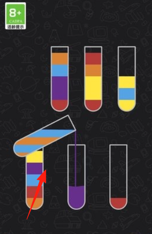 1、查看箭头指向试管的颜色分布(橙、蓝、紫、橙),确定目标颜色(如紫色),找对应空试管。