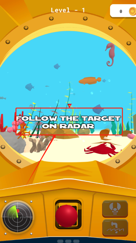 2、留意红框里的提示“FOLLOWTHETARGETONRADAR”,按照指示通过雷达定位目标,控制潜艇跟随雷达上的目标移动,前往任务地点。