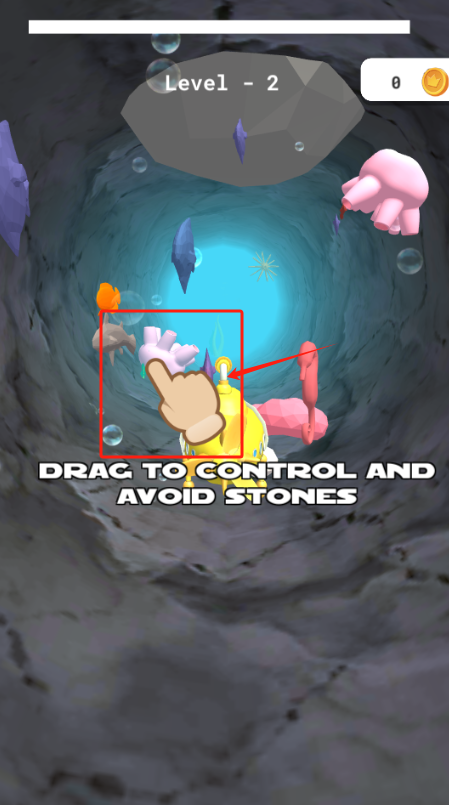 3、根据提示“DRAGTOCONTROL”,通过拖动屏幕来操控潜艇的移动方向,航行过程中要躲开海底的石头等障碍物,同时注意右上角的分数变化,记录你的冒险成果。