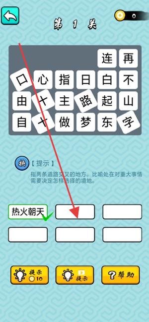2、第1关依据提示(道路交叉),在字块中找字,组合成“十字路口”成语,填入对应空格。