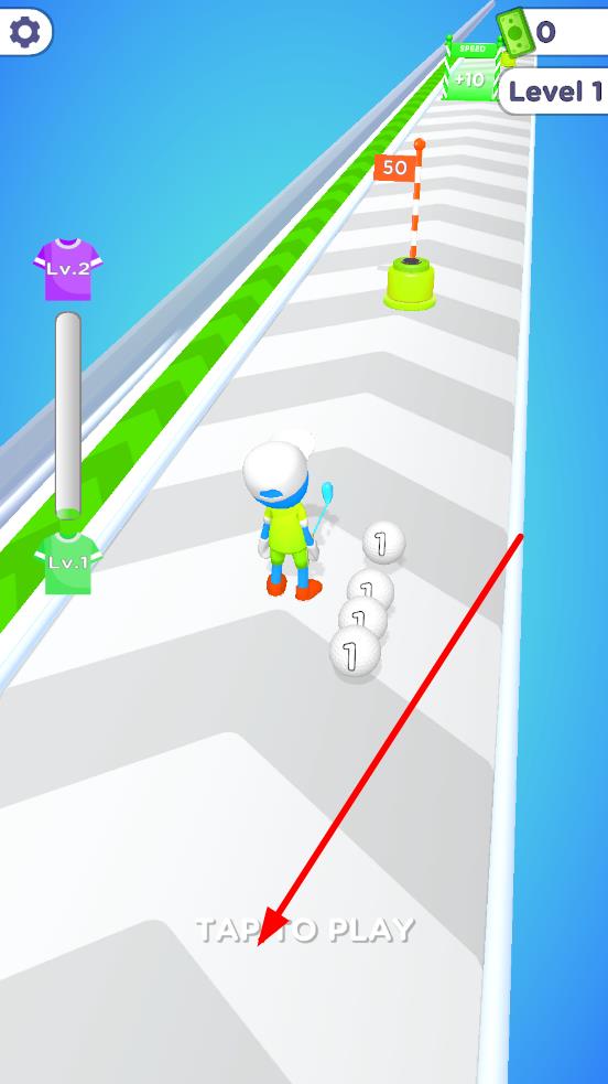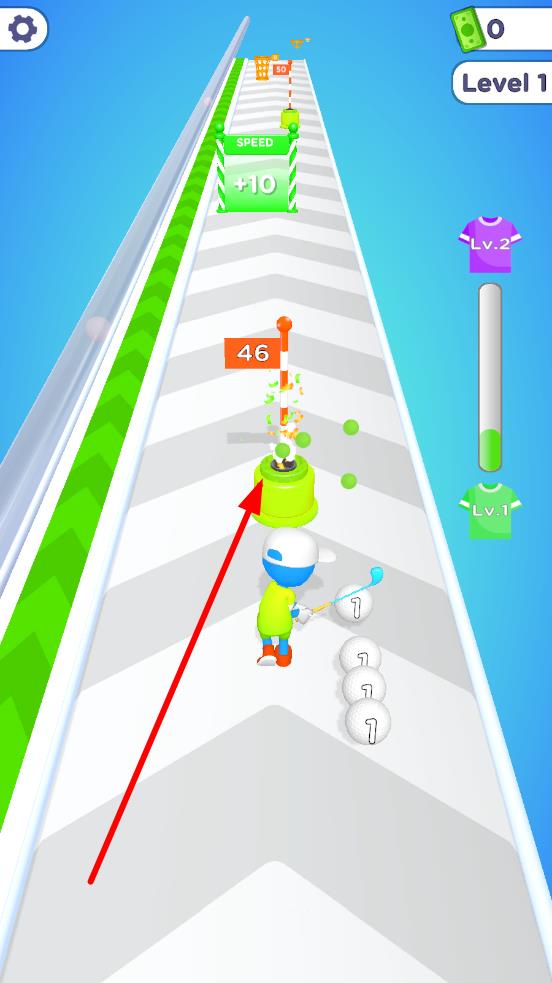1、进入初始赛道,学习滑动控制击球方向、点击确定力度的基础操作,尝试在跑酷中完成首个击球进洞,熟悉跑酷节奏与击球时机,获取初始高尔夫球杆奖励。