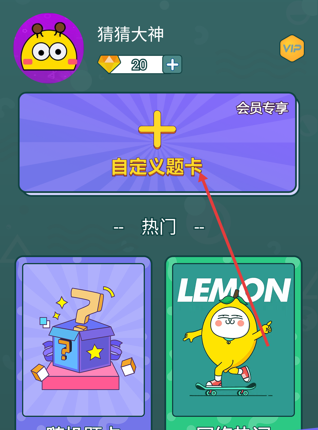 1、在主界面,点击【自定义题卡】(会员专享),可创建专属题卡,添加封面、标题、词语,丰富游戏内容,开启个性化猜谜。