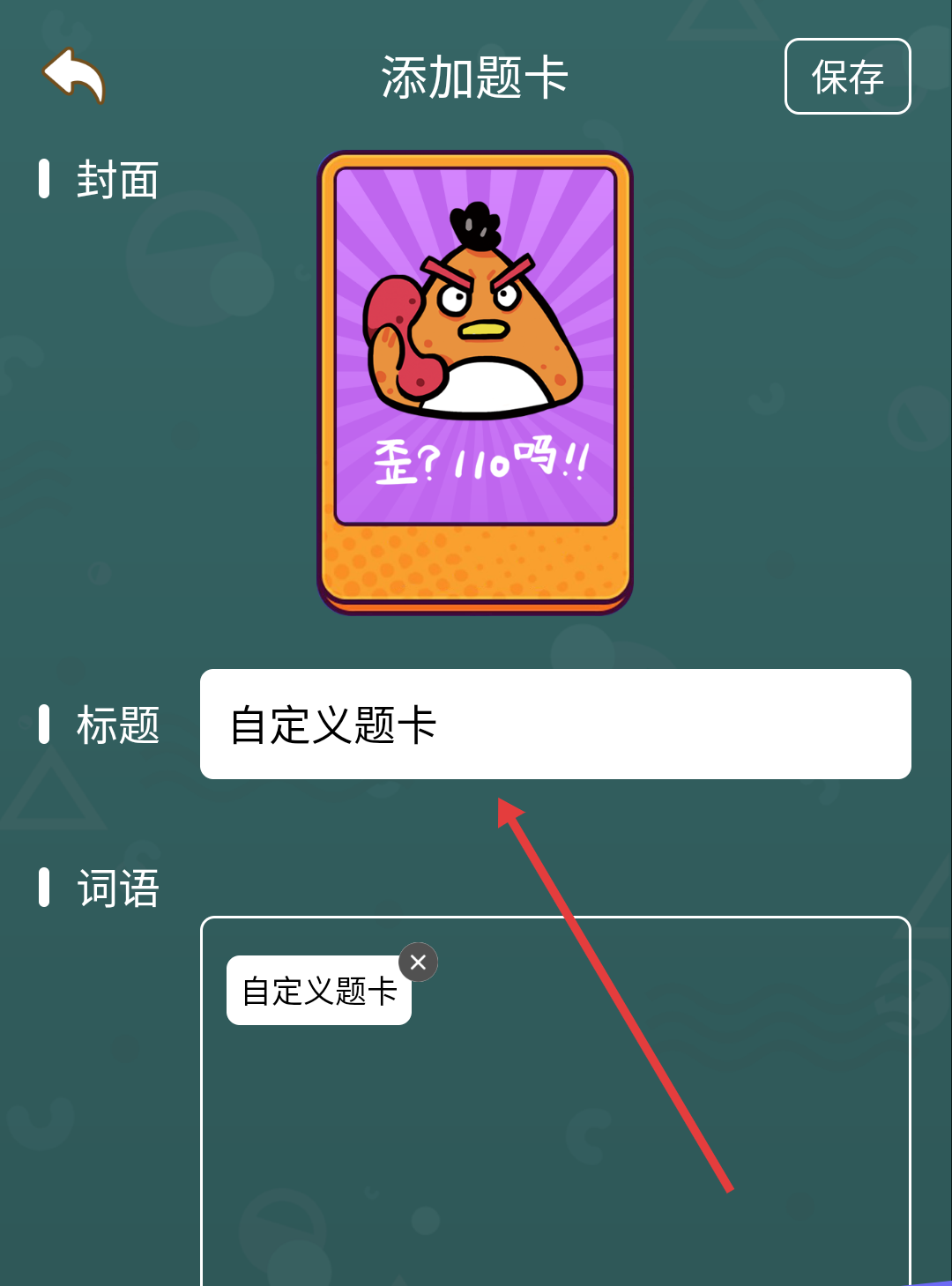 2、进入【添加题卡】页,设置封面(如卡通图案)、标题(自定义题卡)、词语(输入猜谜内容),完成后点【保存】,生成专属题卡用于游戏。