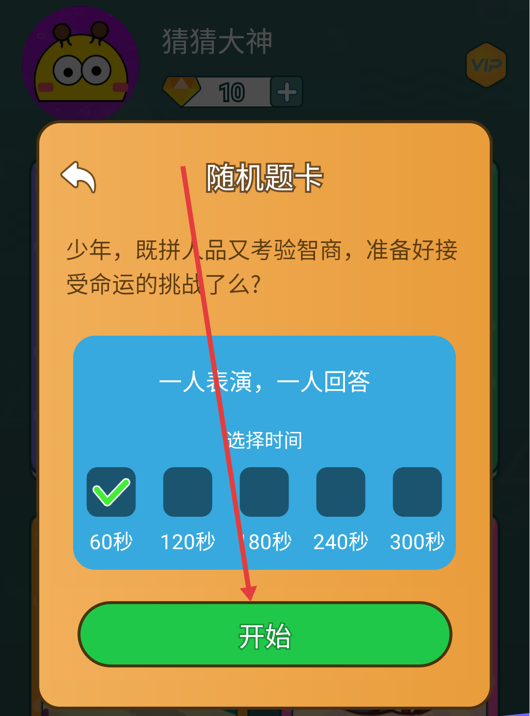 3、选择【随机题卡】,确认时间(如60秒),点击【开始】,进入“一人表演、一人回答”模式,按规则参与猜谜,考验默契与智商。