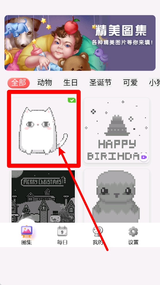 2.在图集中点击任意图片即可进入填色界面,种类丰富涵盖动物、节日、卡通等多种风格任你选择。