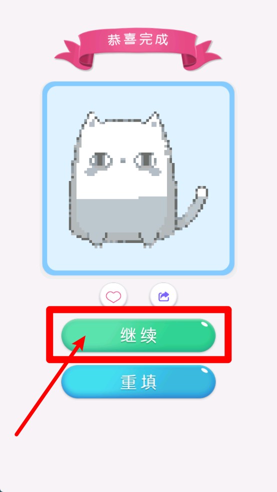 3.完成像素填色后,系统会显示“恭喜完成”,点击“继续”按钮即可保存并进入下一个作品继续涂色。