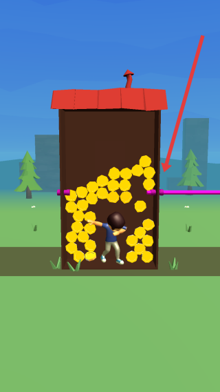 2、拉针后,金币下落,需避开角色,若失败可重开,成功后进入新关卡,继续拉针解谜,获取金币。