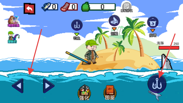 3、在游戏场景中,通过左下角方向键移动角色,点击右下角鱼钩图标钓鱼,利用“强化”“图鉴”等功能,提升钓鱼体验与收获。
