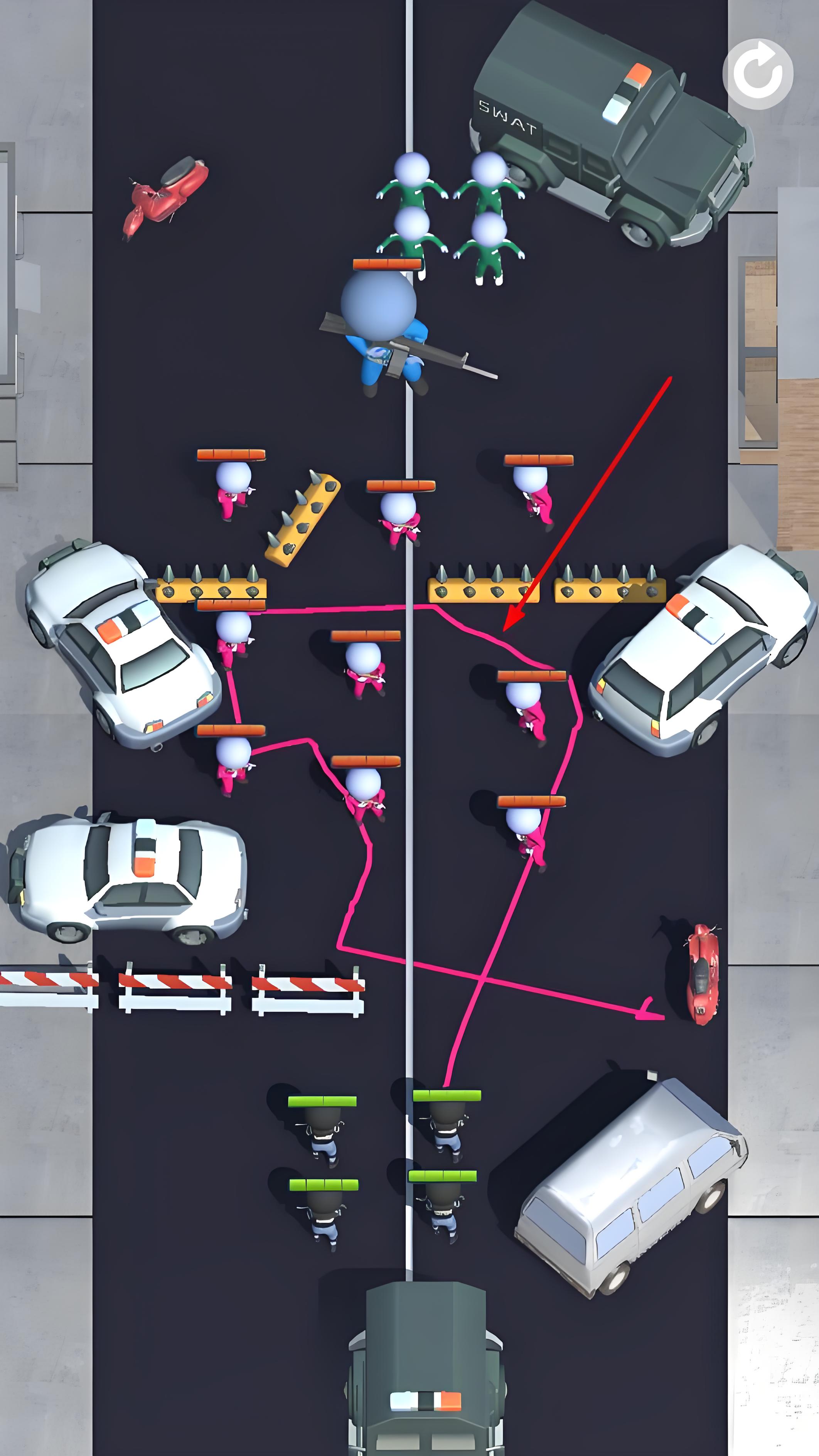 2、绘制红色路线,指挥角色避开障碍(如路障、尖刺),攻击粉色敌人,推进关卡。