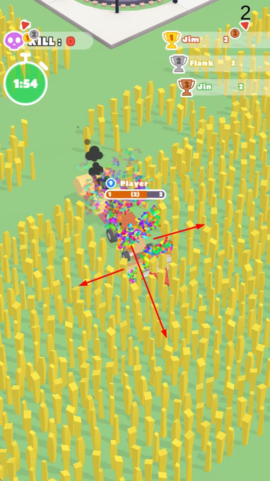 2、“玩家对战”,与其他玩家(Jim、Flank、Jin等)同场竞技,碰撞争夺麦田区域,增加击杀数(0→1→2)。