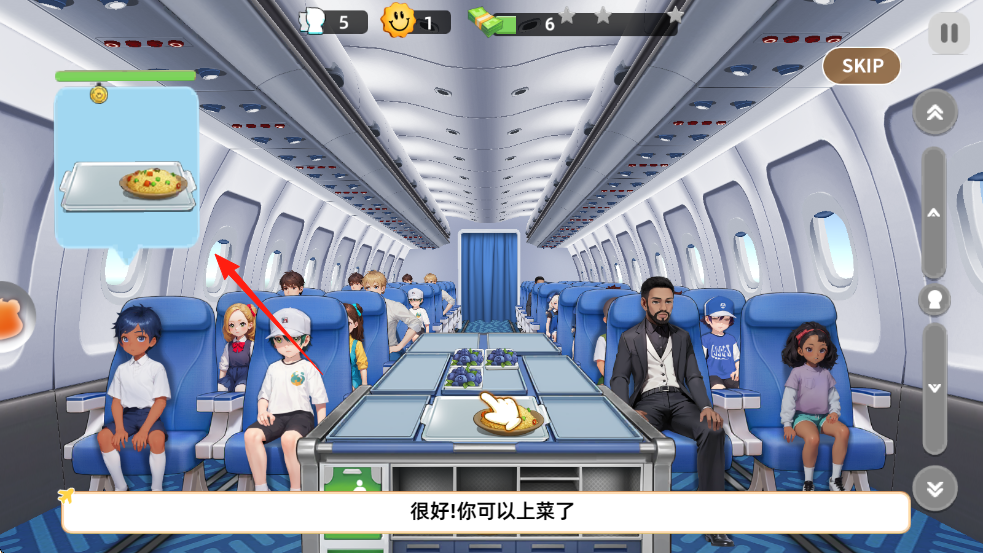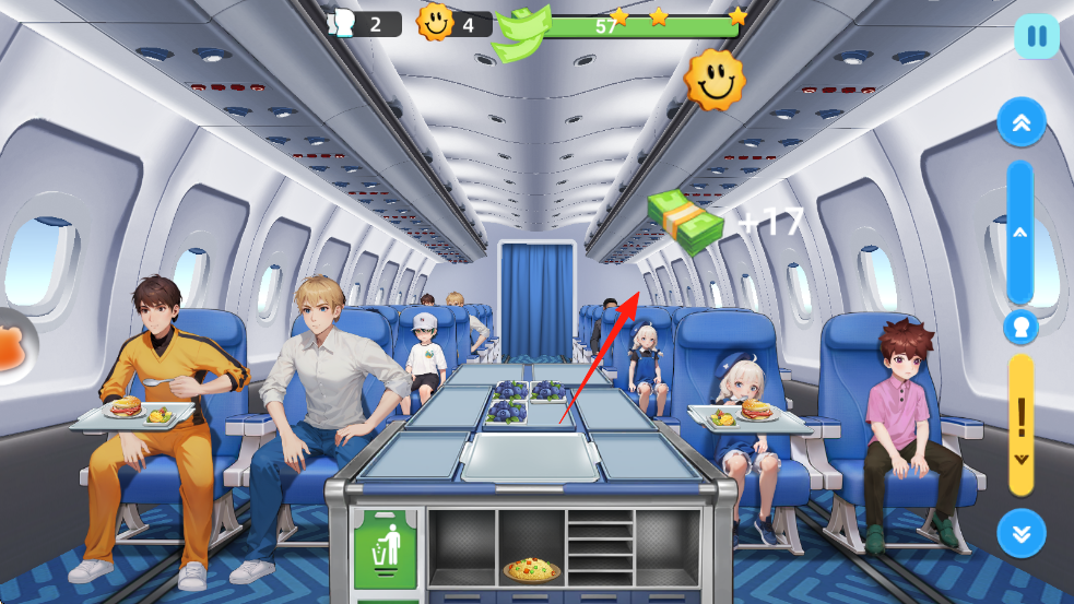 3、持续为乘客上菜,获得金币(如箭头指向的收益),积累资源升级餐厅设施、解锁新菜品。