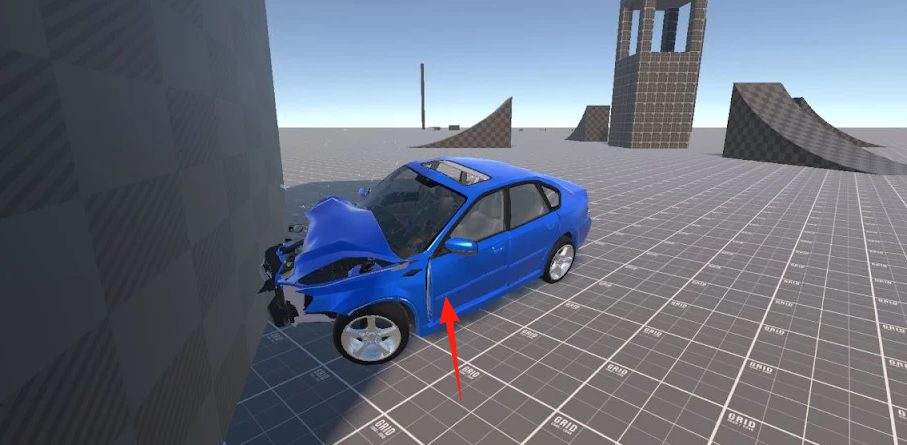 2、操控车辆加速,使其朝箭头方向行驶,撞击障碍物,观察物理反馈与车辆损坏效果。