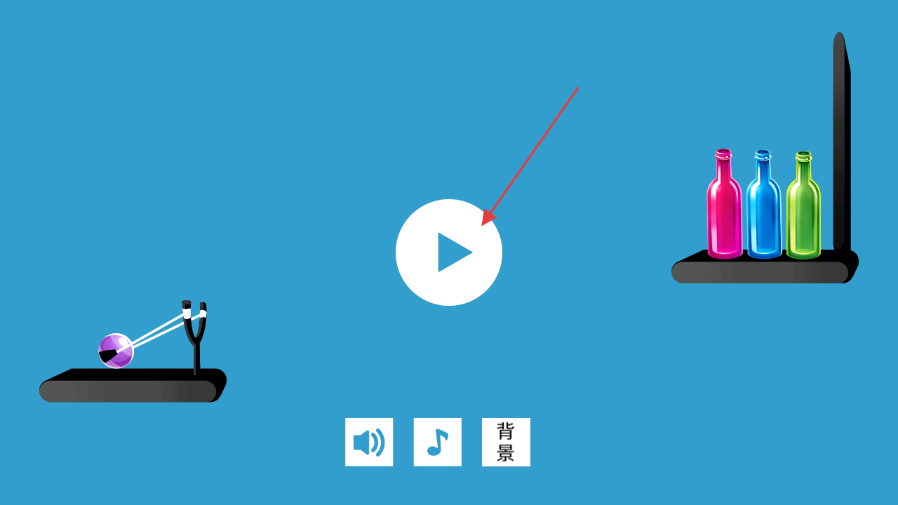 1、进入游戏后,点击开始按钮进入游戏关卡玩家拥有一定数量的球(如3个),目标是用球射击并击碎架子上的彩色瓶子。