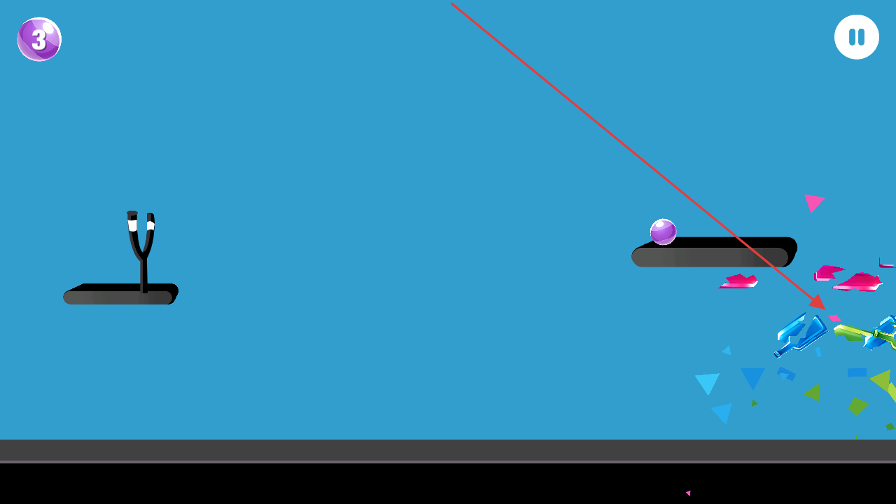 2、在游戏界面中,通过调整弹弓的角度和力度,发射紫色的球,瞄准架子上的瓶子每个瓶子被击碎后会获得相应的分数。