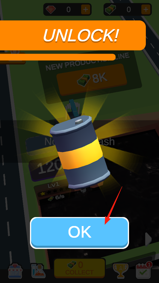 3、产线建造完成后,弹出“UNLOCK!”提示,点击“OK”确认,借解锁反馈机制,完成新产线启用,回到主界面可使用新增产能,体验成就感与玩法拓展的衔接。