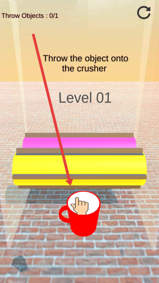2、Level01关卡,按“Throw-the-object-onto-the-crusher”提示,拖动红色杯子,扔到粉碎机,完成投掷任务。