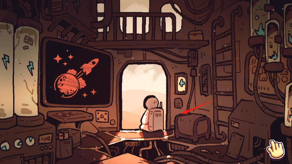 1、身处太空舱场景,点击右侧互动区域,触发外出探索指令,借场景交互,让宇航员离开舱室,开启外星环境冒险,体验从基地到未知领域的过渡玩法。