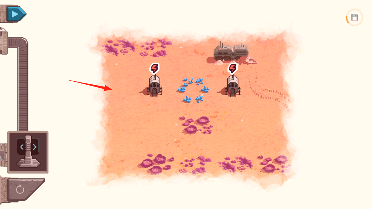 2、进入外星荒漠,移动至红色箭头指向的建筑,借探索机制,靠近标有闪电图标的设施,准备解锁新功能或触发事件,感受外星场景的资源探索乐趣。