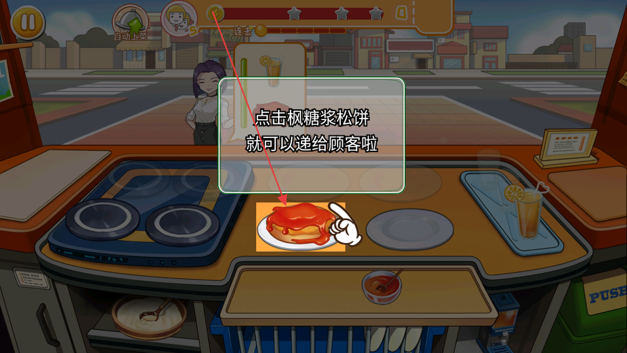 2、通过点击操作,将制作好的食物(如点击枫糖浆松饼、橙汁)递送给顾客,完成订单达成连击可获额外奖励。
