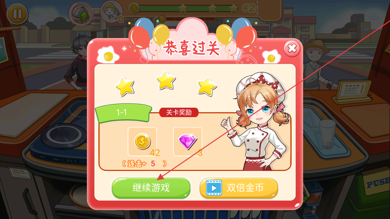 3、成功完成关卡订单后,可获得金币、钻石等奖励,点击“继续游戏”进入下一关,随着关卡推进,订单复杂度。