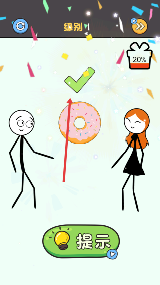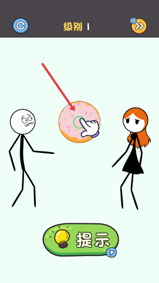 3、当成功完成交互(像甜甜圈上方出现对勾),即可顺利通关级别1,进而解锁后续更多关卡,过程中还能借助“提示”按钮获取解谜助力。