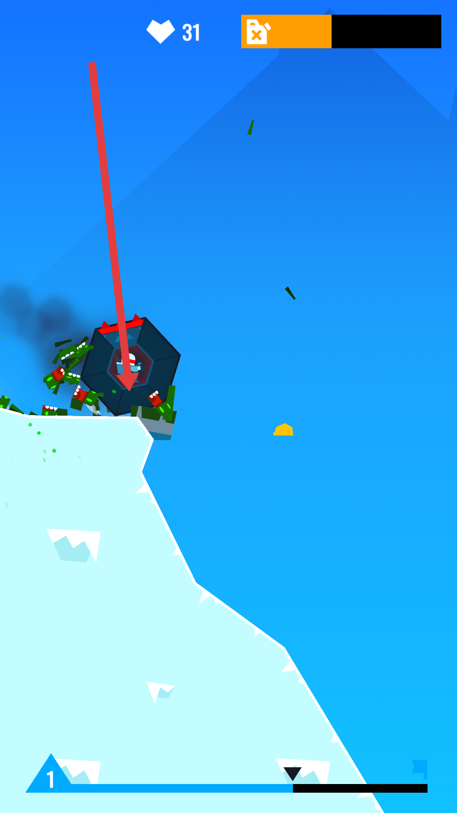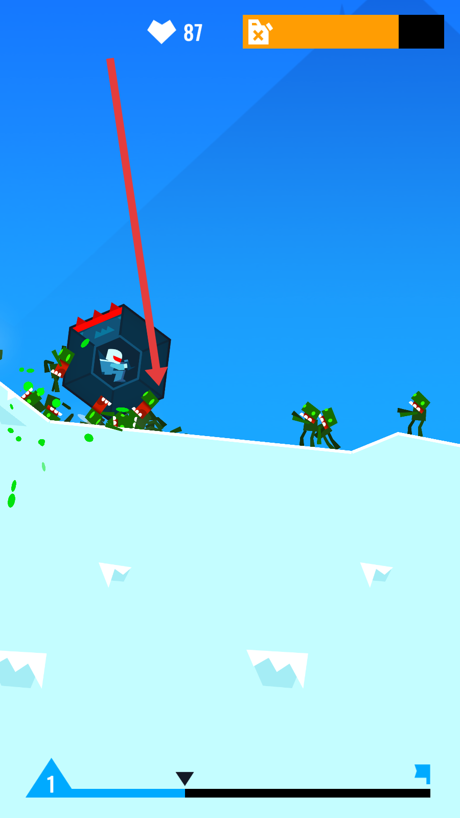 2、关卡中角色驾驶带锯齿的六边形载具,在雪地坡道滚动,撞击绿色怪物,把绿色怪物均数消灭。