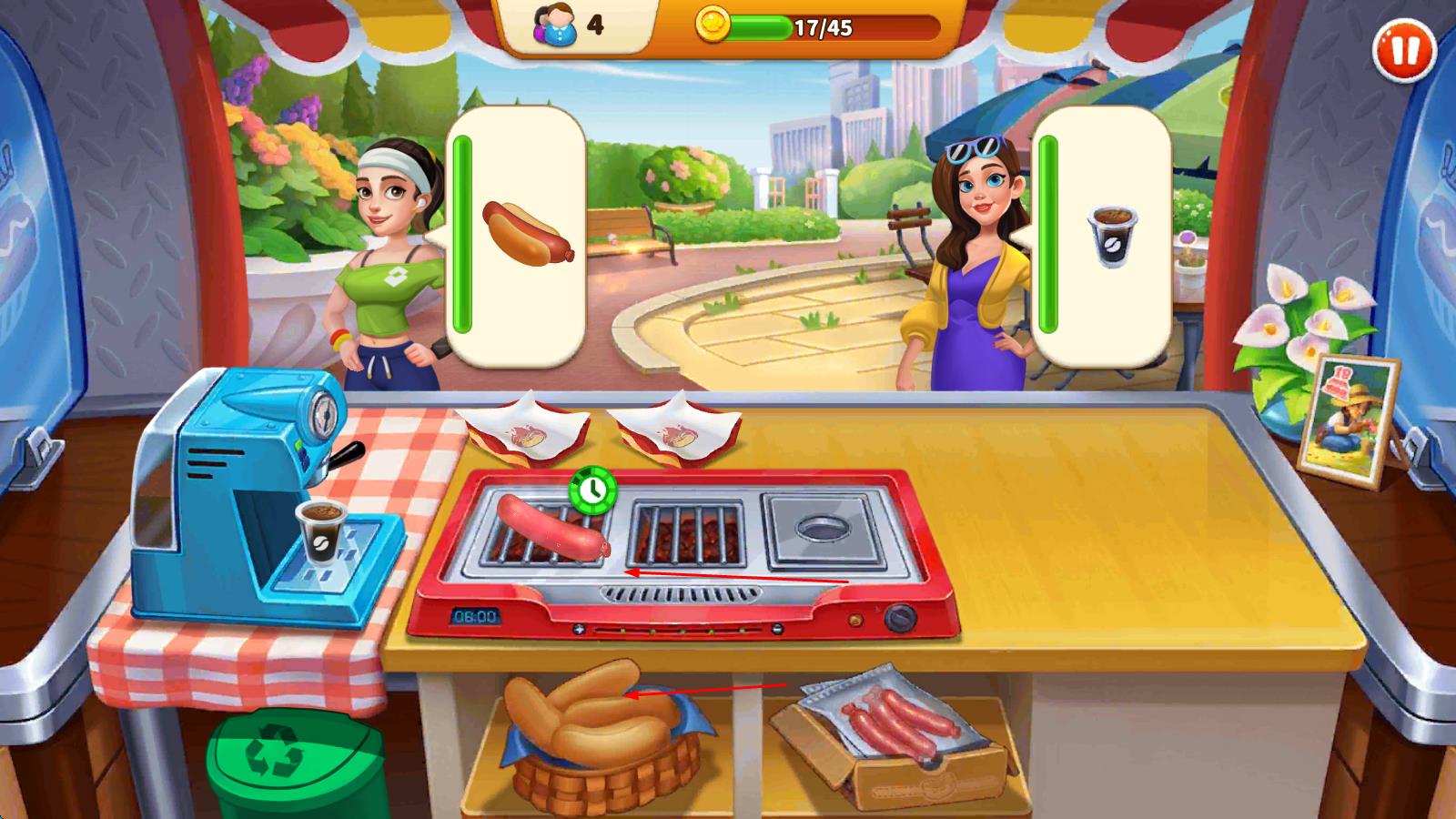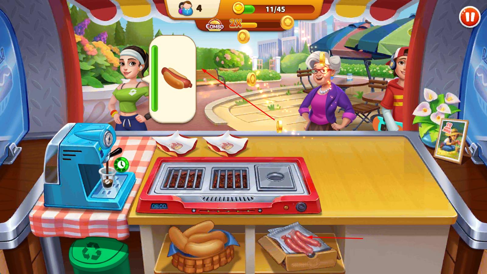 1、进入游戏,在助理指导下熟悉餐车操作,从意大利面美食街开始,接受首批顾客订单,按需求烹饪食物,在限时内完成上餐与结账,完成首关目标。