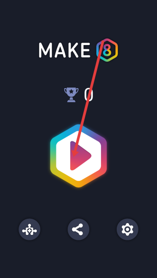 1、首张是《Make8》游戏启动界面,有标题“MAKE8”、奖杯(数量0)、彩色六边形播放按钮,下方设创建、分享、设置图标。