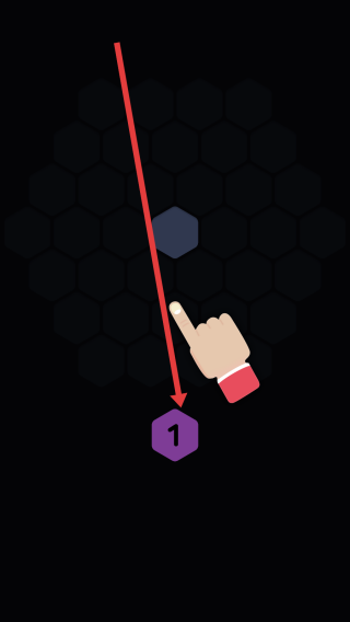 2、第二张是游戏关卡界面,黑色背景配六边形网格,手指指向中间深蓝色六边形,下方有紫色标“1”的六边形,呈现操作引导。