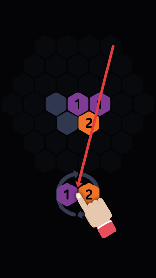3、第三张是关卡过程界面,黑色背景六边形网格上有标“1”“2”的彩色六边形,手指演示交换操作,展示合并数字的核心玩法。