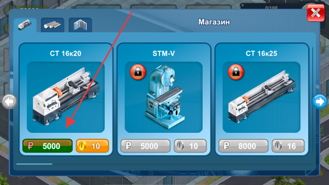 2、选择“CT16x20”机床(消耗5000₽和10金币)。