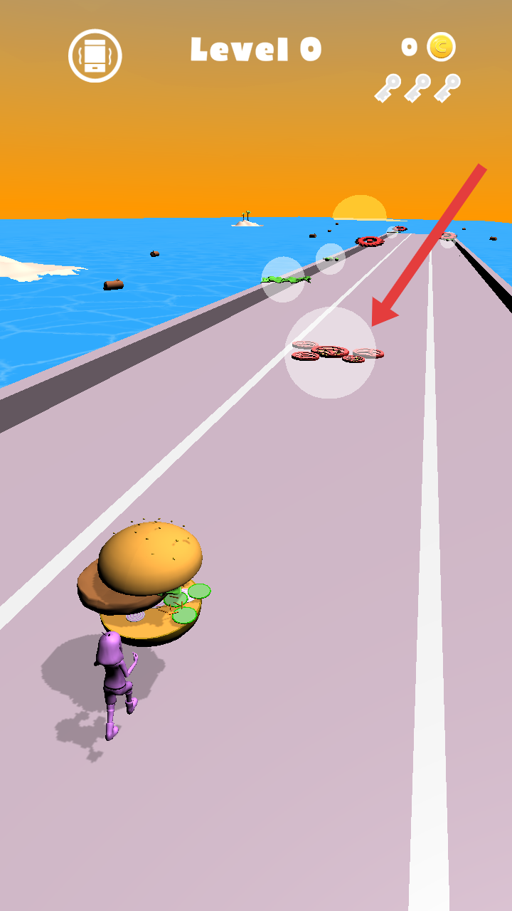 2、在进行奔跑时,操控角色朝向箭头标注的汉堡肉移动,进行精准的收集来丰富手中的汉堡。