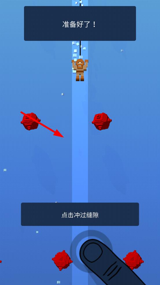 1、控制被绳子吊着的小人开始沉降,通过点击屏幕进行冲刺,熟悉操作节奏,避开初始遇到的障碍物。